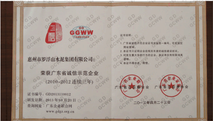 羅浮山水泥集團(tuán)連續(xù)五年榮獲"廣東省誠信示范企業(yè)"